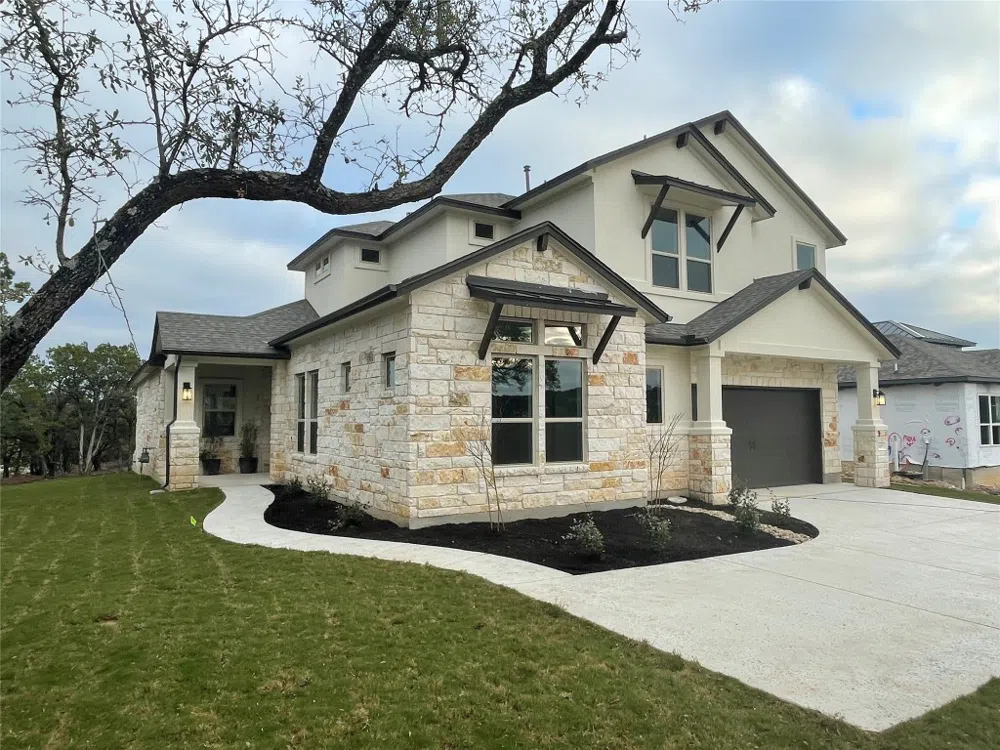 2-1 Buydown or 2% of contract sales price toward closing costs if buyer uses preferred lender. Must close home by end of April. READY FOR MOVE IN! Giddens Homes in The Hollows on Lake Travis. 1.5 story home, primary bedroom downstairs along with study, powder bath, laundry and guest room and full bath. Upstairs game room with surround sound prewire, 2 secondary bedrooms and 2 full baths. Large family room with wood-beamed ceiling and floor to ceiling stone fireplace. Sliding doors lead to large covered patio with outdoor kitchen, great for entertaining. Kitchen with center island with quartz countertops, tons of storage, upper cabinets to 10' with puck lighting and glass fronts, farmhouse sink. Luxury vinyl plank flooring in main living areas, beautiful designer finishes.